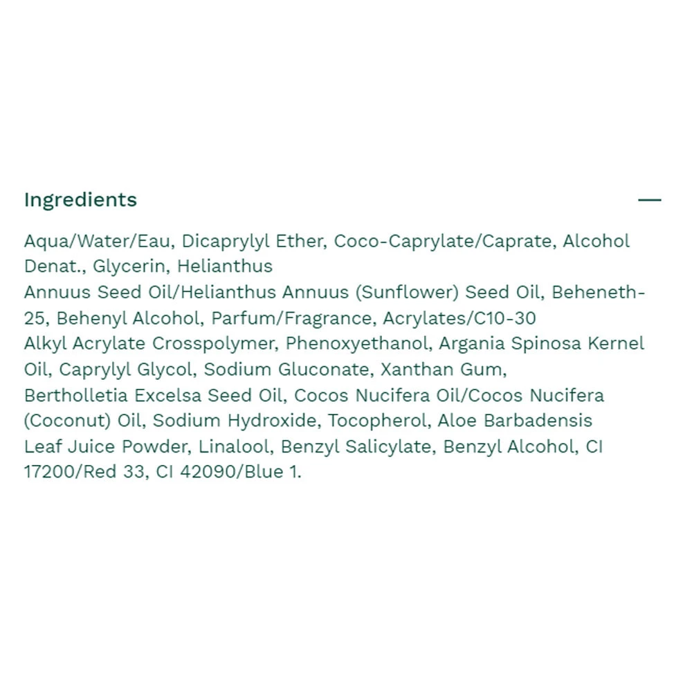Vsebuje mešanico rastlinskih izvlečkov, ki so znani po svoji čistosti in naravnem izvoru. Formulacija je obogatena z rastlinskimi masli, ki koži nudijo občutek mehkobe in gladkosti brez uporabe težkih kemikalij.