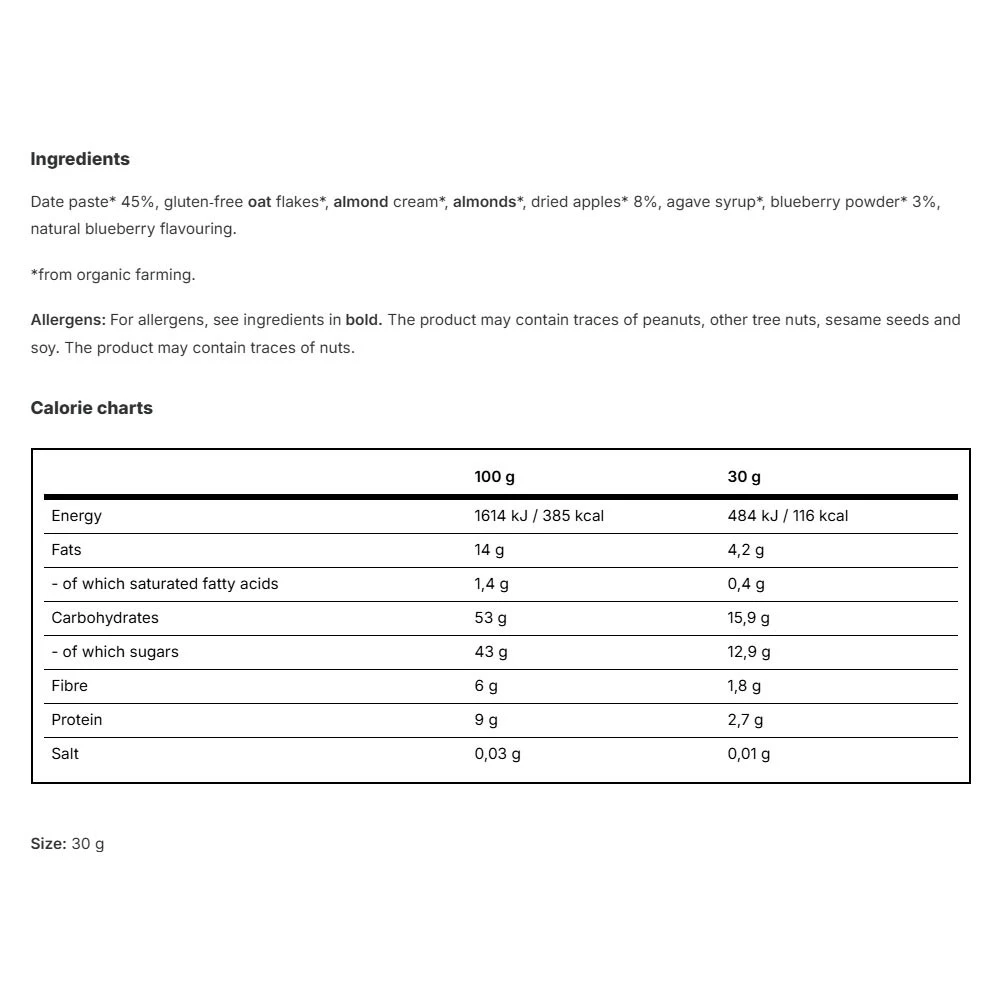 Izdelek je narejen iz visokokakovostnih naravnih sestavin, kot so borovnice in jabolka. Brez dodanih umetnih arom ali konzervansov, ta energijska kroglica zagotavlja čisto uživanje v sadnih okusih.