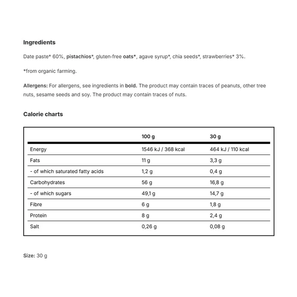 Izdelek vsebuje naravne sestavine, kot so suho sadje in oreščki, ki zagotavljajo prijeten okus jagode. Vse sestavine so pridobljene na ekološki način, brez dodatkov umetnih arom ali konzervansov.