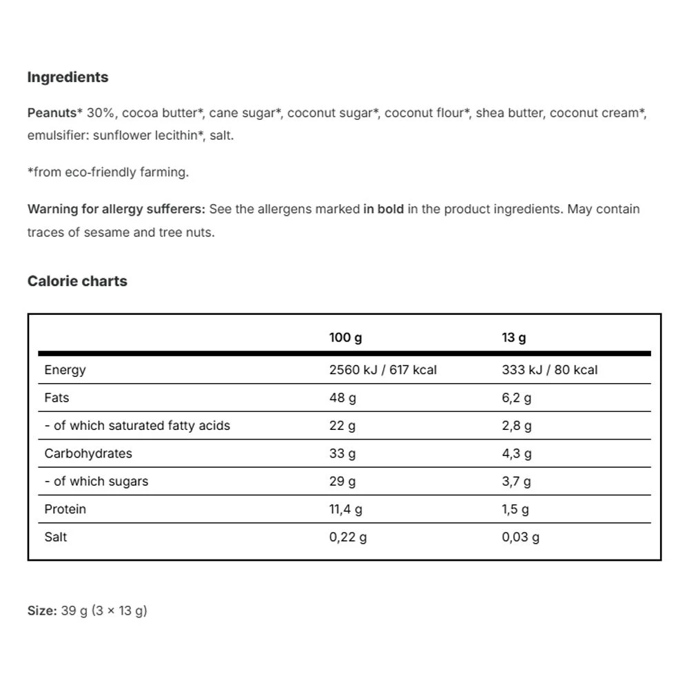 Izdelek vsebuje visokokakovostno arašidovo maslo in belo čokolado, ki sta pridelani brez uporabe umetnih dodatkov. Arašidi so pridelani na naraven način,kar zagotavlja poln okus in teksturo,medtem ko bela čokolada dodaja nežno sladkobo.