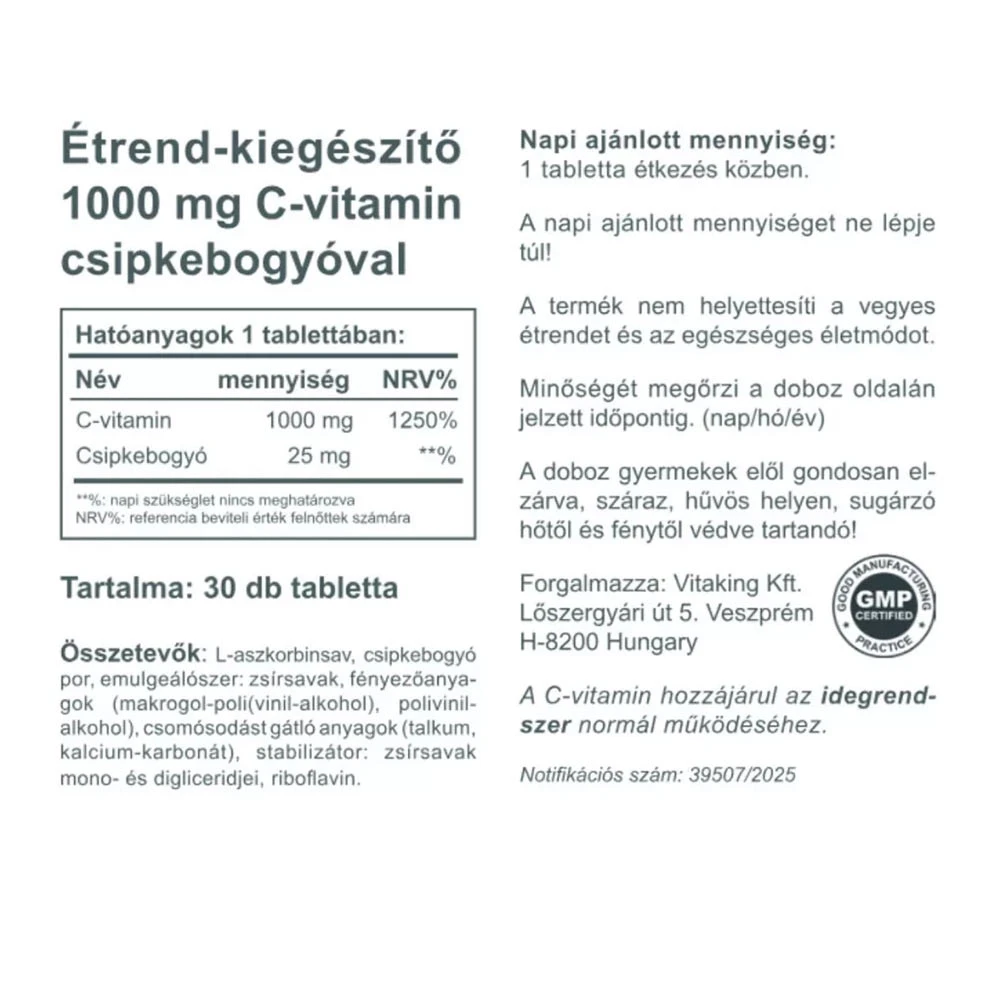 prehranski dodatek Vitaking C-1000 mg z dodatkom 25 mg šipka v obliki tablet je izdelek visoke kakovosti, ki združuje naravne sestavine. Pakiranje vsebuje 30 tablet, kar omogoča enostavno in priročno uporabo.