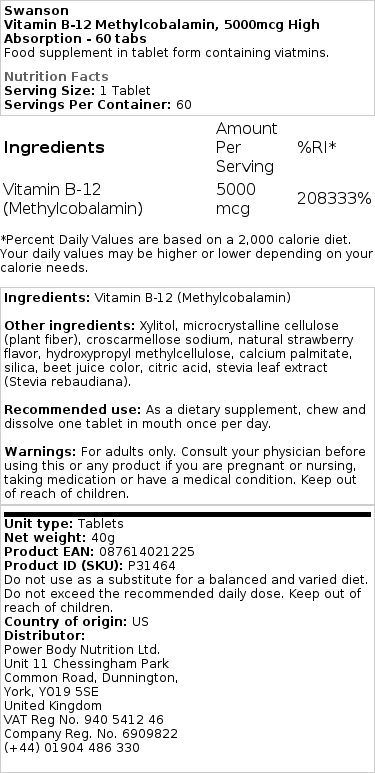 Sestavine: vitamin B-12 (metilkobalamin) Druge sestavine: ksilitol, mikrokristalna celuloza (rastlinska vlakna), premreženi natrijev karmelozat, naravna aroma jagode, hidroksipropilmetilceluloza, kalcijev palmitat, silicijev dioksid, barva pesnega soka, citronska kislina, izvleček listov stevije (Stevia rebaudiana) . Priporočena uporaba: Kot prehransko dopolnilo prežvečite in raztopite eno tableto v ustih enkrat dnevno. Opozorila: Samo za odrasle. Pred uporabo tega ali katerega koli izdelka se posvetujte z zdravnikom, če ste noseči ali dojite, jemljete zdravila ali imate zdravstveno stanje. Hraniti izven dosega otrok.