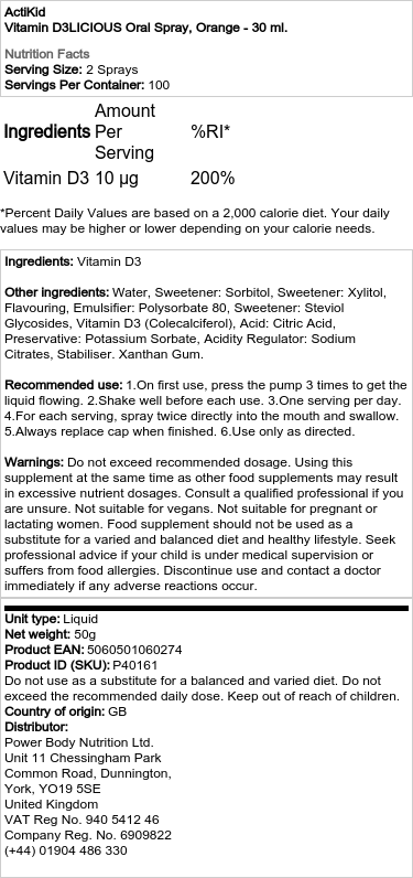 ActiKid Vitamin D3LICIOUS ustno pršilo je na voljo v okusni pomaranči, ki bo zagotovo všeč vašim otrokom. Pršilo je enostavno za uporabo, saj ga lahko otroci enostavno razpršijo v usta, brez potrebe po vodi ali žvečenju tablet. To je še posebej priročno za otroke, ki imajo težave z zaužitjem tablet ali kapsul.