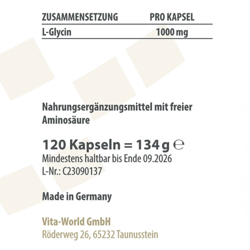 Prehranski dodatek Vitaworld L-glycine vsebuje 1000 mg glicina na kapsulo,pakirano v priročni obliki s 120 kapsulami v embalaži. Glicin je naravna snov, ki jo najdemo v različnih živilih in je pridobljena skozi previdno izbran postopek za zagotavljanje visoke čistosti in kakovosti.
