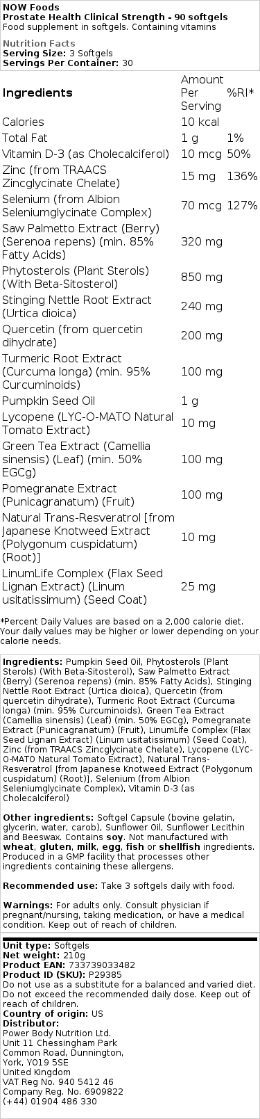 Sestavine: bučno olje, fitosteroli (z beta-sitosterolom), izvleček žagaste palme (jagode) (Serenoa repens) (min. 85 % maščobnih kislin), izvleček koprive (Urtica dioica), kvercetin (iz kvercetin dihidrata), izvleček kurkume ( Curcuma longa) (najmanj 95 % kurkuminoidov), izvleček zelenega čaja (Camellia sinensis) (list) (najmanj 50 % EGCg), izvleček granatnega jabolka (Punicagranatum) (sad), LinumLife Complex (laneno seme), izvleček lignana) (Linum usitatissimum ) (lupina semena), cink (iz TRAACS cinkovega glicinatnega kelata), likopen (LYC-O-MATO naravni izvleček paradižnika), naravni trans-resveratrol [iz izvlečka japonskega dresnika (Polygonum cuspidatum) (korenina)], selen (iz Albionovega selenijevega glicinata). Kompleks), vitamin D-3 (kot holekalciferol) Druge sestavine: mehka kapsula (goveja želatina, glicerin, voda, rožičev), sončnično olje, sončnični lecitin in čebelji vosek. Vsebuje sojo. Ni narejeno iz sestavin pšenice, glutena, mleka, jajc, rib ali školjk. Proizvedeno v obratu GMP, ki obdeluje druge sestavine, ki vsebujejo te alergene. Priporočena uporaba: Zaužijte 3 mehke kapsule dnevno s hrano. Opozorila: Samo za odrasle. Posvetujte se z zdravnikom, če ste noseči/dojite, jemljete zdravila ali imate zdravstveno stanje. Hraniti izven dosega otrok.