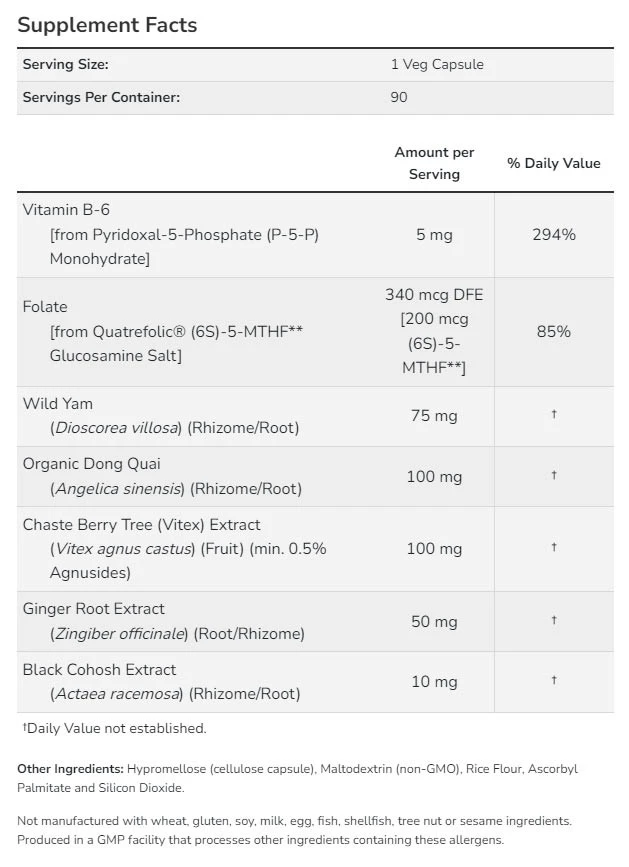 Sestavine: boragino olje v prahu (Borago officinalis) (semena) (15 mg GLA), organski Dong Quai (Angelica sinensis) (korenina/korenina), divji jam (Dioscorea villosa) (korenika/korenina), ekstrakt čednega jagodičja (Vitex) ( Vitex agnus castus) (sadje) (najmanj 0,5 % agnuzidov), vitamin B-6 (iz piridoksin HCl), izvleček črnega kohoša (Actaea racemosa) (korenina/korenina), folat DFE (133 mcg folne kisline) Druge sestavine: Celuloza (kapsula), riževa moka, magnezijev stearat (rastlinski vir) in silicijev dioksid. Ni narejeno iz sestavin pšenice, glutena, soje, mleka, jajc, rib, školjk ali drevesnih oreščkov. Proizvedeno v obratu GMP, ki obdeluje druge sestavine, ki vsebujejo te alergene. Priporočena uporaba: Vzemite 1 kapsulo 3-krat dnevno s hrano. Opozorila: Samo za odrasle. Posvetujte se z zdravnikom, če jemljete zdravila ali imate zdravstveno stanje. Tega izdelka ne smete uživati v prvem tednu menstruacije. Ni namenjeno nosečnicam ali doječim materam. Hraniti izven dosega otrok.