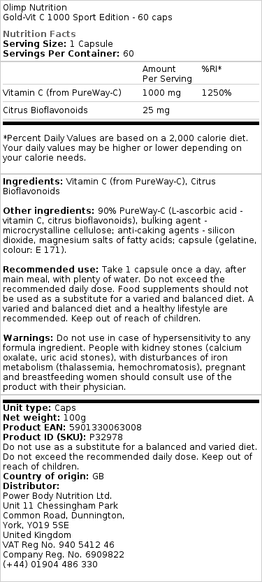 Olimp Nutrition Gold-Vit C 1000 Sport Edition – 60 kapsul Prehransko dopolnilo v obliki kapsul, ki vsebuje vitamin C in bioflavonoide citrusov.